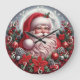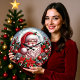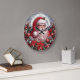 This vibrant Christmas clock features a jolly Santa Claus with a full white beard and traditional red suit, set against a large full moon and a snowy, starry night. He is surrounded by a rich border of red plaid, pine sprigs, poinsettias, and pinecones. The image is highly decorative and festive, incorporating traditional holiday elements with a detailed, three-dimensional style. The design may look real due to the high detail and three-dimensional texture in the artwork.