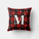 This festive custom throw pillow features a rustic winter design. The background features a red plaid pattern with falling snowflakes. A sample monogram initial is printed in the centre of the pillow which you can personalise to include your own custom initial or other text.