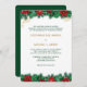 This is an elegant and pretty Holiday Season wedding invitation that features Christmas greenery and red poinsettia blossoms as a top and bottom border. The top border also has gold berries and a swirl embellishment to add extra interest. Your custom text is in matching green and gold at the centre, and there is plenty of room for changes. The back of the invitation is solid Christmas green.