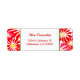 Festive return address labels with editable script letters in red, on a white background with a gold sides, on a red poinsettia allover holiday pattern.