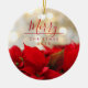 A christmas ornament with a festive holiday photograph featuring a bouquet of red poinsettias along the bottom. Shimmering golden bokeh lights in the background.