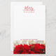 Personalised stationery with a festive holiday photograph featuring a bouquet of red poinsettias along the bottom. Shimmering golden bokeh lights in the background.