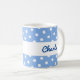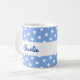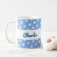 A stylish blue and white mug, with a fun polka dot pattern. Personalise with the recipient's name, which will appear in blue script typography on both the front and back of the design, on a white band around the mug.