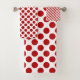 The towel set shows the red polka dots design in red on white. For customisation enquiries please contact info@KBMD3signs.com