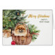 On this Holiday card, a beautiful red Pomeranian dog lays in his wicker basket bed in front of a decorated Christmas tree. Also behind the basket is a pretty red holly berry and pine cone bouquet. The gold script text at the right says "MERRY CHRISTMAS", with HAPPY NEW YEAR in green below it. All the text, inside and out, may be easily changed to anything you'd like. You can see more Pomeranian images, as well as other breed images, at Dog Village.