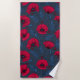 Red poppies and ladybugs on dark blue blue beach towel