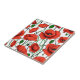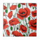 Ceramic tile in a delicate pattern of vibrant red poppies with deep green stems and leaves, on a while background, with, each poppy bloom uniquely curved and twisted, as if swaying gently in the breeze.