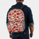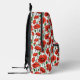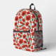Backpack in a delicate pattern of vibrant red poppies with deep green stems and leaves, on a while background, with, each poppy bloom uniquely curved and twisted, as if swaying gently in the breeze.