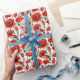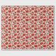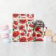 Wrapping paper in a delicate pattern of vibrant red poppies with deep green stems and leaves, on a while background, with, each poppy bloom uniquely curved and twisted, as if swaying gently in the breeze.