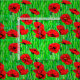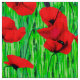 Fabric in a semi-abstract, watercolor pattern of red poppies in a field, against green stems and leaves