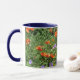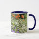 White mug with dark blue rim and handle, decorated with a photo of a colourful flowerbed.