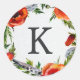 A colourful, bold, and elegant floral monogram design in red, oranges, greens, and greys.