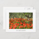 Photo postcard of a field with red poppy flowers under old olive trees in an orchard in the countryside of Italy in summer with a white border and the text 'Tuscany'.
