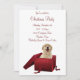 Red Christmas present box with a golden retriever puppy dog inside Christmas party invitations.