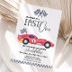 Start your engines and Race on over! This charming birthday invitation features a vintage race car in striking watercolor shades of Red, complete with a fiery flame shooting from the back wheel for extra excitement! With a minimalistic design and playful energy, this FAST ONE birthday invitation is perfect for little speedsters and classic car lovers alike. Ideal for a boy's birthday party, this stylish and fun design sets the tone for a high-octane celebration.