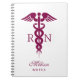 Personalised notebook with a stylish red cadaceus symbol with the letters R N on either side. Simple minimalist design.