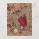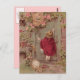 Vintage Red Riding Hood illustration with and soft pink roses. Wolf in grandma's clothing peeks out through the window as Red waits to come in.