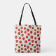 Tote Bag in a scattered pattern of red ripe strawberries on a red and white pin dot background