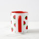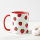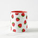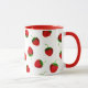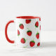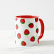 Coffee mug in a scattered pattern of red ripe strawberries on a white background