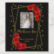 Gold and black Quinceañera with vibrant traditional red roses and classic script typography. Photo template via Pixabay licensed under CC0 and must be replaced with your own photo