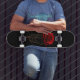 A blood-red rose bound in iron chains on a black background creates a glorious Goth skateboard.