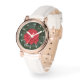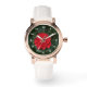 A photograph of a red rose in a garden. The blossom is fully open exposing the yellow stems of the centre. A pair of red buds are growing behind the main flower. The background is full of green leaves. This watch has a white clock-face number set on the rose picture. Image Copyright ©Kimberly J Tilley.
