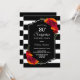 Black and white striped surprise 80th birthday party invitation featuring elegant red and orange floral displays. Text is fully customisable to enable you to include all of your own information for your birthday celebration.
