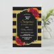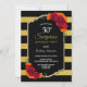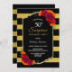 Black and gold striped surprise 50th birthday party invitation featuring elegant red and orange floral displays. Text is fully customisable to enable you to include all of your own information for your birthday celebration. (NB: Faux glitter has been featured on this invitation.)