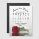 These beautiful magnetic save the date calendar cards are a wonderful way to let your family and friends know about your upcoming wedding. The design features a photo of a single long-stemmed red rose lying on its side reflecting in a pool of water with waves and ripples. The calendar has a red heart that you can put around your wedding date. Simple, elegant, and romantic these cards are sure to please.
