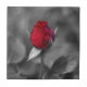 This ceramic tile features a red rosebud in contrast to black and white background.