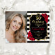 Elegant floral feminine 50th birthday invitation with your photo. Glam black white red design with faux glitter gold. Features black and white stripes, red roses, script font and confetti. Perfect for a stylish adult bday celebration party. Personalise with your own details. Can be customised for any age! Printed Zazzle invitations or instant download digital printable template.