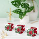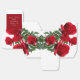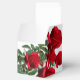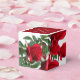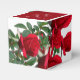 Wedding shower or reception favour boxes with red roses design. Customise text on box top with white script over dark red background. The sample message is, "Much love and thanks for being here today - names of couple". Stems of beautiful red roses wrap around the edge and bottom of these cute little boxes which are 2 inches square and will be put together by the purchaser. This design may transfer to other sizes and shapes. They will print as shown, so do not let any wording get covered or go off the edge.