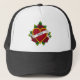 Personalise Mum tattoo trucker hat with three red roses, a gold edge heart and a ribbon with the word MOM in the centre all in classic tattoo style. You can change the text to any Mother or a name on the mug. A great trucker hat to give as a mothers day gift for the Mum your life.