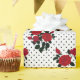 Red roses on a white background with black polka dots.