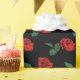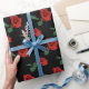 This elegant wrapping paper features a repeating abstract pattern of a single red rose with green leaves set on a pure black background.