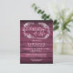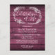 A rustic celebration of life remembrance invitation postcard featuring a hand-drawn foliage garland on a red wood panels background. Designed by Thisisnotme©
