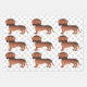 Destei's original cartoon illustration of an adorable smooth hair red sable coat colour Dachshund breed dog. The dog design is placed nine times on each sheet. The background has a pattern of grey dog paw prints.