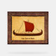 A Viking long ship with a red sail seen in profile from the right side. It is superimposed on an old paper background image and there is also an intricately carved wooden frame. Customise by adding your own additional text.