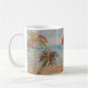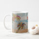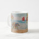 Sailboat with red sails, sailing on beautiful blue ocean water with cloudy skies and whimsical palm trees in foreground.