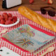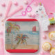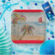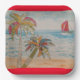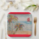 Red sails, sailing the ocean blue amidst whimsical colourful palm trees, created as a mixed-media work of art.