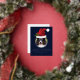 Personalizable Christmas photo template design where a red Santa hat illustration by Destei is placed above a round photo. The Santa hat has a green Christmas Holly plant on it and the background colour is dark blue. Under the image there are two personalizable text areas that are placed in the foil design area.