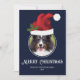 Personalizable Christmas photo template design where a red Santa hat illustration by Destei is placed above a round photo. The Santa hat has a green Christmas Holly plant on it and the background colour is dark blue. Under the image there are two personalizable text areas.