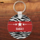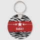 Trendy and modern Sassy Star Zebra Keychain featuring a chic black and white zebra print background and a bold red border adorned with a fun star motif. This girly design may be customised with the personalised text of your choosing. Click "Customise It" to find more personalisation options.