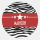 Trendy and modern Sassy Star Zebra Stickers featuring a chic black and white zebra print background and a bold red border adorned with a fun star motif. This girly design may be customised with the personalised text of your choosing. Click "Customise It" to find more personalisation options.