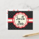 This charming postcard features a red frame encasing a Save the Date message highlighted against a fun black and white polka dot background. The back of the postcard can be fully personalised with names of the bride and groom, wedding date, and location.