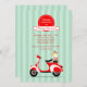 A zippy design for a birthday celebration. The striped background features a red banner header and a red and white scooter with a birthday cupcake. The cupcake can be dragged to any location or eliminated.