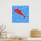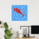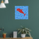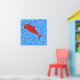 A red colour shark cartoon on a blue patterned background. The shark and blue pattern are a printed design, it is not a raised or textured design.