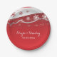 Red, silver grey, white snowflake winter wedding paper plate, featuring a waved band in silver grey with stars and red elegant snowflakes on glowing gradient red background. Modern and contemporary yet suitable for a traditional wedding. This elegant, classy and stylish design is a perfect choice for winter, December or Christmas weddings, bridal shower, reception, engagement, or anniversary party.