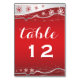 Red, silver grey, white snowflake winter wedding table number place card, featuring a waved band in silver grey with stars and elegant snowflakes on glowing gradient red background. Modern and contemporary yet suitable for a traditional wedding. This elegant, classy and stylish design is a perfect choice for winter, December or Christmas weddings.
