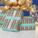 Red skis with snow on blue wrapping paper